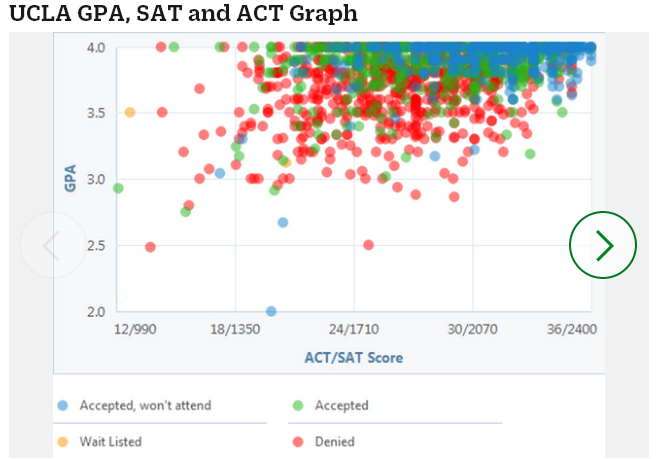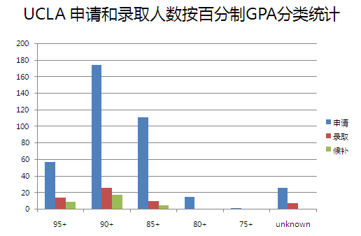 图表说明:GPA是申请美国大学第一重要因素。这张图展示的是新东方前途出国2014年秋所有申请UCLA的学生的GPA情况。蓝色表示申请的学生,红色表示录取的学生,绿色表示候补的学生。可以清楚的看到,GPA低于3.5几乎很少有录。