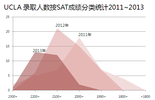 图表说明:这张图展示的新东方前途出国2011年、2012年、2013年这三年所有录取UCLA的学生的SAT分数分布,大家可以看到录取UCLA学生的SAT分数逐年升高,比如2011年,1800、1900还能够幸运的进入UCLA,到了2013年,2000分以下进入UCLA已经是凤毛麟角,1900分以下则完全不可能再进入UCLA。