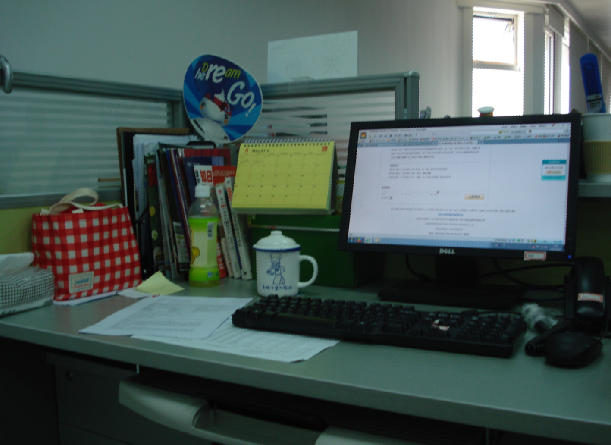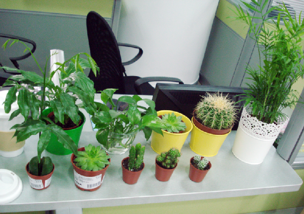 办公桌上摆上了大大小小可爱而清新的绿色盆栽,绿叶掩映中,让人嗅到了一种若有似无的自然气息。