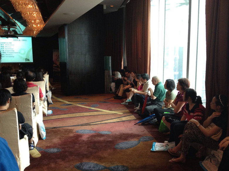 在讲座厅里,我们新东方前途出国副总裁余仲秋老师,曾经GRE满分的他,在华尔街工作5年,带来的讲座《从新东方到华尔街》,吸引了太多的家长关注,导致座位全部做满,尽管有些没有位置的家长和同学们直接席地而坐,但依然听的非常认真。并且还在奋笔疾书将余老师的话,记录下来。