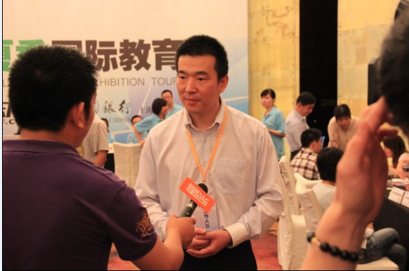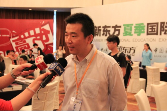 图为:上海新东方前途出国上海分公司总经理 孙涛老师接受东方卫视和上海电视采访