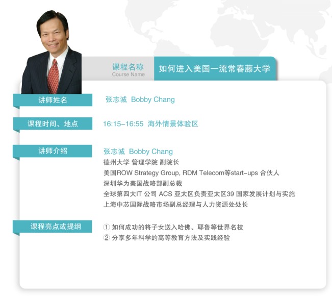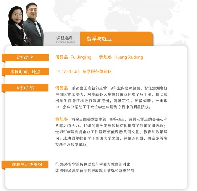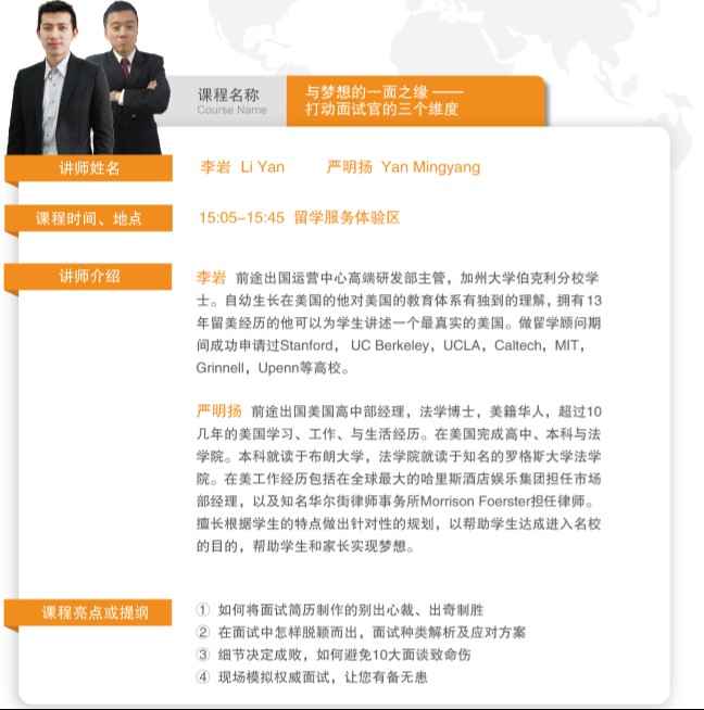 本次教育展最大的亮点是以“体验”为主题,建立海外情景体验区,打造海外院校模拟课堂,从布景,到氛围,到授课方式,再到师生互动,完全与海外院校同步,让您不出国门也能对国外了如指掌。另外,拥有全球顶尖名校教育背景、世界名企工作经验的资深留学顾问将为您免费量身定制留学规划以及面试指导。他们将真诚分享自身的留学、求职和工作经历,传授过来人的成功经验。除此之外,新东方名师现场教授最热门的语言考试课程,让您体验典型新东方式的教学模式和效果。