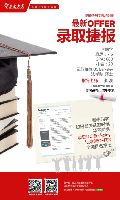他是这位同学,第一次走进前途办公室进行留学咨询的时候,他选择了英国顾问老师,用他的成绩攻克下一所英国的学校是绝对没有问题的,从与他咨询的过程中,不断透露出他的内心是非常向往美国名校,但是苦于他自己的成绩让他没有信心去冲刺,前途出国的英国咨询老师深刻感受到了他的痛苦,特转由美国研究生张液老师重新对他进行美国留学的咨询。接下来就是等待,等待成绩等待结果的时候,所有的等待都是一种带着期盼的煎熬,直到上周,好消息传来了,这位同学收到了加州大学伯克利分校(UC Berkeley)法学院的offer。在老师告诉这位同学:“你被录取了。”那一刹那,这位同学的激动心情无言以表,而张液老师更多的是笑容,一种自信,一种成就,一种为孩子圆梦的美好笑容。