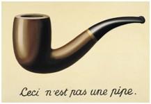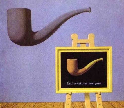 本文的作者先是从一幅Rene Magritte于1920年代画的一幅名为The Treachery of Images的画(请见图一)说起。这幅画里画的是一支很逼真的烟斗,下面用法语写着”这不是一支烟斗”。紧接着作者又描述了Magritte画的另外一幅名为The Two Mysteries的画(请见图二)。这幅画中俨然安放着刚才提到的第一幅画,而且在那幅画外又出现了另外一支烟斗,仿佛更大也离我们更近了。说到这里,笔者就指出,如果第一幅画正如Magritte说指出的它并不是一支烟斗的话,那么第二幅画中出现在画外的那支烟斗是什么?作者进一步指出,显然画家的用意不是花这么大的功夫告诉我们画画得再逼真也终究是画,而不是实物。他还指出要真正理解画家的用意关键在于那个画框,理解它的概念为何。他说画家的用意在于挑战出现在画框之外的任何事物都是真实存在这一信念(The point is to challenge the belief that everything outside the frame is real).