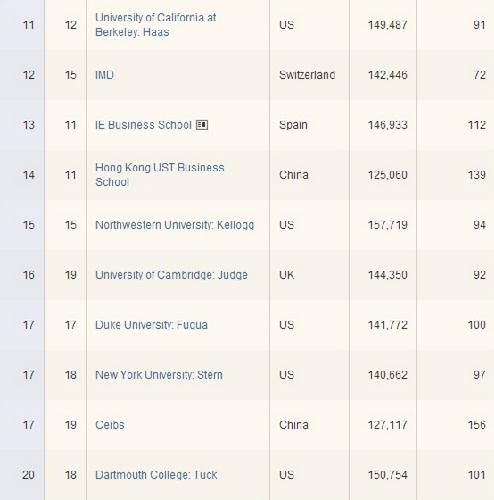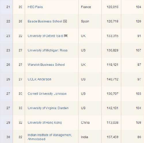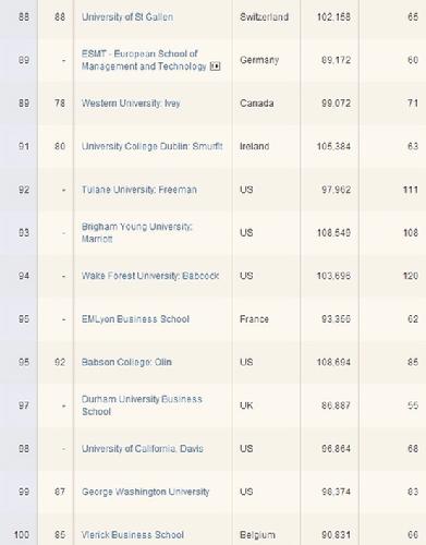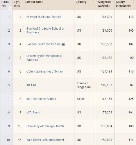 2014年排行榜也是如此:哈佛商学院(Harvard Business School)击败所有竞争对手,继续蝉联去年失而复得的冠军宝座。这是自1999年英国《金融时报》编制该榜单以来哈佛第五次夺冠。斯坦福大学商学院(Stanford Graduate School of Business)仍然屈居亚军,伦敦商学院( London Business School)则超过宾夕法尼亚大学沃顿商学院(Wharton School of the University of Pennsylvania),升至季军位置,后者排名第四。哥伦比亚商学院(Columbia Business School)和欧洲工商管理学院(Insead)并列第五。