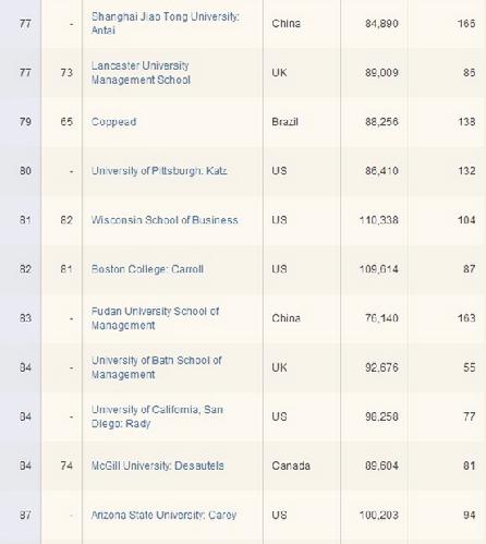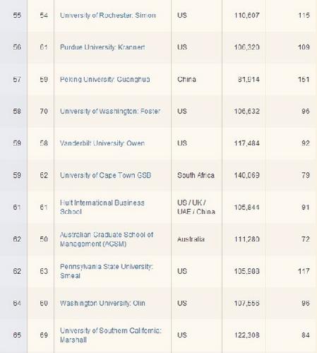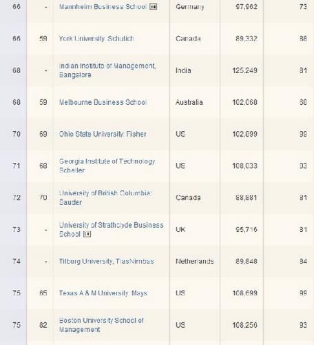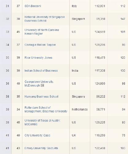 排名上升最快的商学院之一是耶鲁管理学院(Yale School of Management),该学院的排名上升4位,排名第10。这是7年来该学院首次进入10强。其他表现强劲的是弗吉尼亚大学(University of Virginia)达顿商学院(Darden school of business),上升8位,排名第27位; 北卡罗莱纳大学(University of North Carolina)克南•弗拉格勒学院(KenanFlagler school)上升12位,排名第32位。明尼苏达大学(University of Minnesota)卡尔森商学院(Carlson school)回到第54位,新上榜商学院中排名最高的是位于班加罗尔的印度管理学院(Indian Institute of Management),排名第68位。