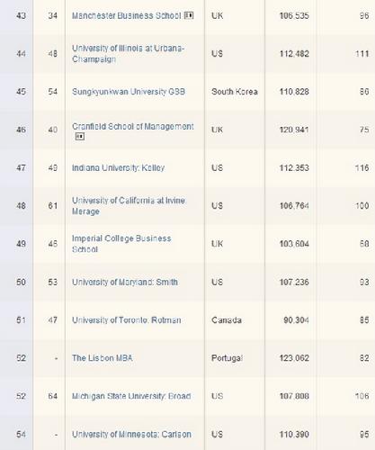 2014年英国《金融时报》全球MBA排行榜基于对各商学院及其2010年毕业校友的两项调查。MBA课程根据校友的职业发展、学院创意成果和师生多样性进行评估。