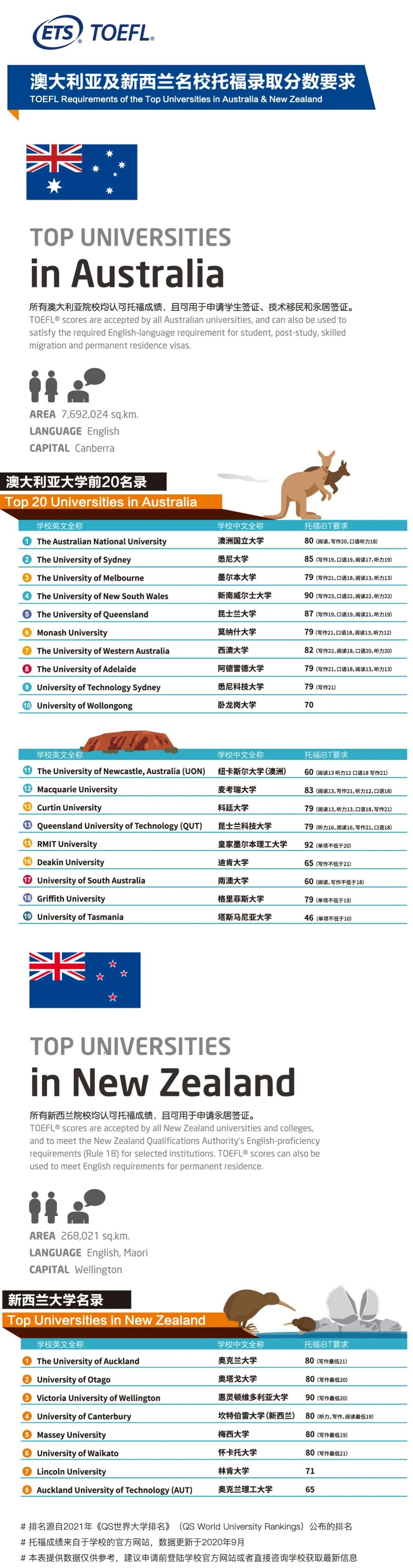 ETS官方近日盘点了全球热门留学目的地托福分数地图,今天我们主要来看下澳新大学对托福成绩的要求!>>在线咨询即可获得留学白皮书一份