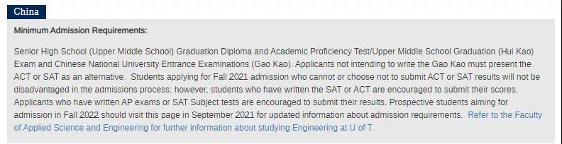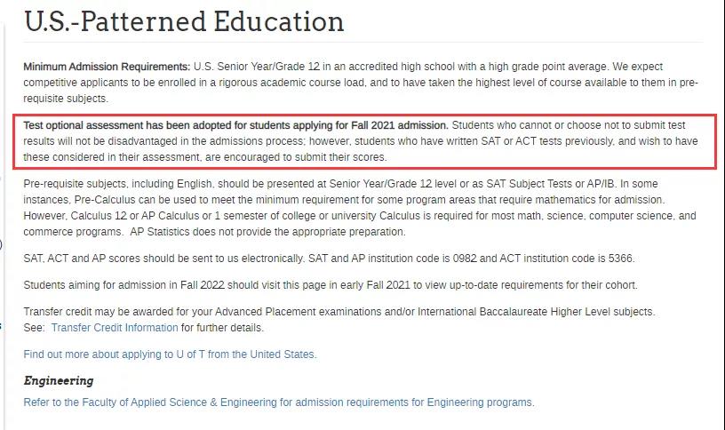 针对2021年秋季入学的申请,学生如果没有参加或者选择不提交SAT和ACT成绩,在录取审理中不会受到劣势对待。然而,此前已经参加了SAT或者ACT考试的学生并且希望将此成绩用于审理中,多伦多大学鼓励这些学生提交他们的成绩。强烈建议申请理科、商科、管理学专业的学生完成AP Calculus考试。此政策适用于文科、理科、商科/管理学、建筑/视觉研究、运动机能和体育教育、音乐专业。工程学院不适用此政策!!!