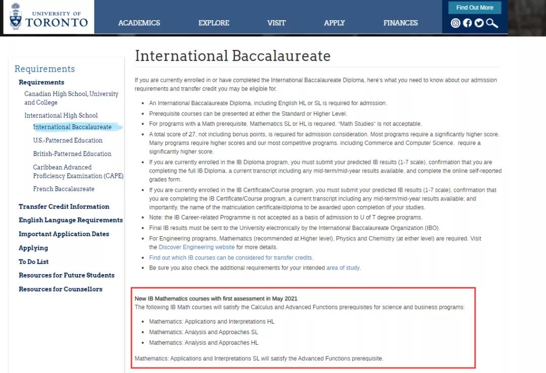 多伦多大学本科录取要求针对于IB体制录取要求有一点变化需要大家注意的是:针对2021年5月首考新版IB Mathematics,如下新版IB数学课程将可以替代Calculus 和 Advanced Functions满足理科和商科相关先修课程的要求: