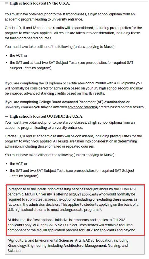国内普高学生,通常情况下要求提交高考成绩,但如果不参加高考,必须提交ACT或者SAT作为替代。但针对于2021年秋季入学的申请如果没有参加或者选择不提交SAT和ACT成绩,在录取审理中不会受到劣势对待。已经参加了SAT或ACT以及AP或SAT科目考试的学生被鼓励提交这些成绩。(2022年秋季入学的政策会在2021年9月更新,请随时关注官网)