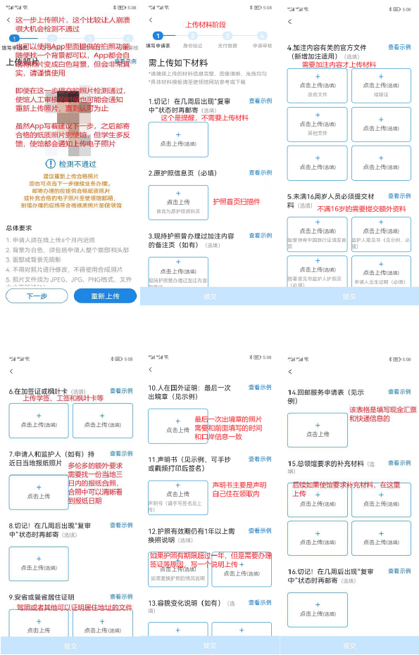 上传的材料要求,各个使领馆有所不同,建议最好先大致填写走一下流程到上传材料阶段,明确所需的材料后,准备好,再重新填写一次,这可以避免反复填写和补充材料;