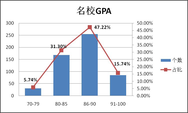 据上图所示,540名申请加拿大排名前十的学生中,94.3% 的学生成绩在80分以上,甚至63%的学生在85分以上,只有很少的学生高中平时成绩在80分以下,因为加拿大排名前十的大学,例如多伦多大学,英属哥伦比亚大学,麦吉尔大学,需要在校成绩至少是88分以上,学生在校成绩很大程度上决定了申请成功率。