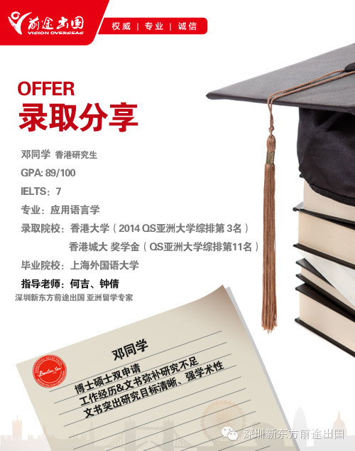 软件方面:学生特别踏实肯干,热心学术,憨厚肯吃苦,对申请中的任何环节都愿意配合。由这位同学硕士已经毕业,并且有将近5年的工作经历,这位同学希望申请香港各大学的博士项目。在顾问老师的指导下,迅速写出了非常高质量的research proposal。同时,在制作文书的过程中,我们和学生一起分析题目,查找他所申请专业的特色突出学生的工作经验和强大本科研究生背景。但是在今年1月份我们收到香港中文大学博士的面试邀请之后,顾问老师迅速针对高端面试需求。给这位同学在第一时间指定详细的面试方案。但是由这位同学相关专业知识储备不足、研究计划还不够明晰,综合这位同学的面试表现,顾问老师认为博士申请成功概率可能不高。在和这位同学沟通之后,我们迅速调整申请方案,同时申请博士类研究型课程和硕士类授课型课程,并制定阶梯形的申请方案。最后,这位同学成功被香港大学应用语言学专业,香港城市大学英语学习专业,香港浸会大学语言学习专业(带奖学金)录取,并选择入读港大。