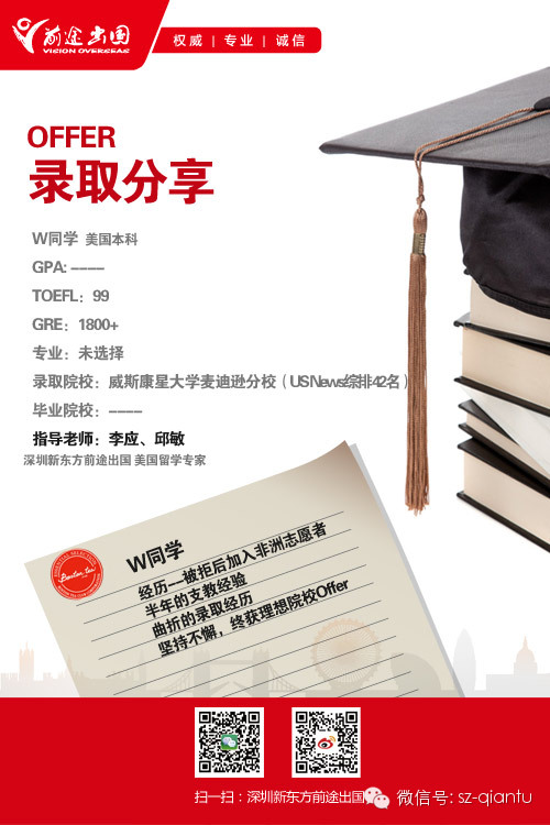 为了尽全力争取University of WisconsinMadison的机会,我们鼓励这位同学将他从回国后从大连出发徒步去新疆的经历写成一篇文章,作为补充材料发给University of Wisconsin Madison的招生官,并亲自打电话给招生官再次表达真诚的意愿。最终,所有的努力都得到了回报。在5月15日,这位同学的邮箱里面收到了University of Wisconsin Madison招生官邮件告知录取。并且,邮件中有一句话很吸引我们,招生官写道“I am contacting you because you have continuedto express interest in studying at UW-Madison through our waitlist process.”正是因为后续的不放弃精神,让招生官对这位同学留下深刻印象,最终能够以TOEFL 99/SAT 1800+的成绩从Waitlist里面录取。