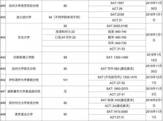 以下是USNEWS公布的2016年美国top100名校申请托福最低成绩要求和SAT ACT平均成绩说明。