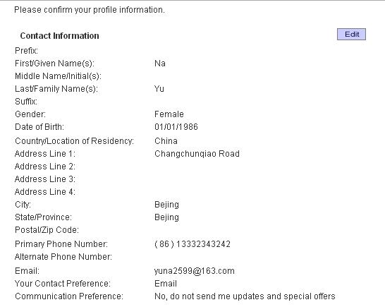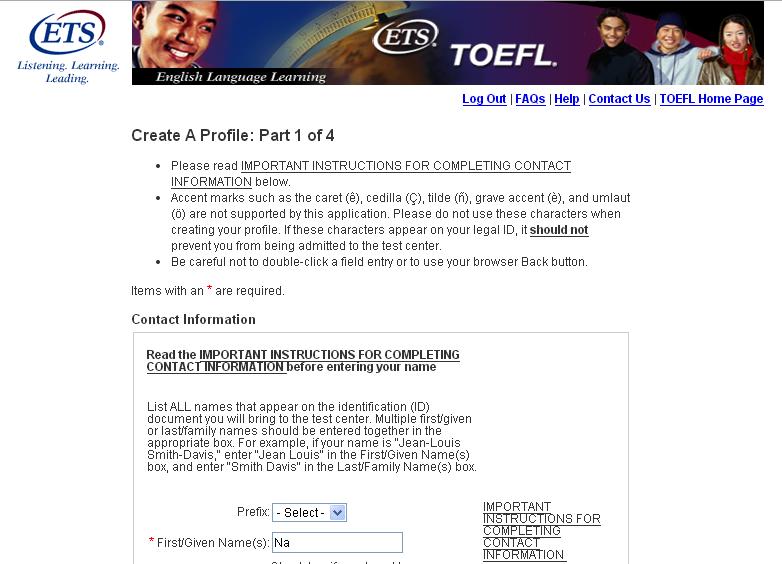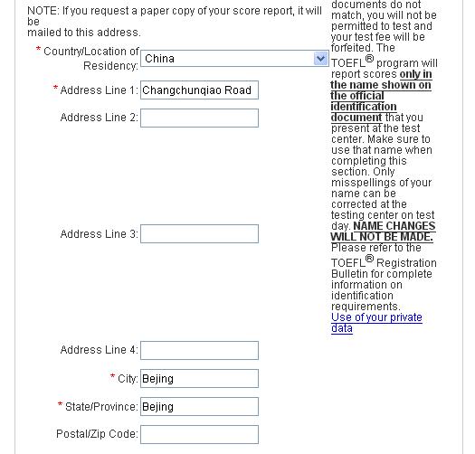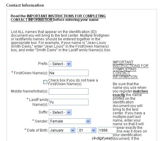 点击注册后,自然要面对无休止的个人问题,一共分为四部分,包括姓名、住址、年龄、邮箱、国籍等等,还需要建立用户名和密码等。在此特别提醒,考生需 要将地址写详细,因为如果在之后选择邮寄成绩单给自己,那么地址必须准确无误。用户名要求在6到16字节之间,包括字母、数字,不能包括特殊字符。密码必 须在8到16字节之间,包括大写字母、小写字母和数字,但是不能包括你用户名中的字母,你的名字或姓氏,否则系统会一直提示错误,无法进入下一步。带红色 星形标记为必须填写内容。每填写完成一部分,需要点击右下角“continue”继续。