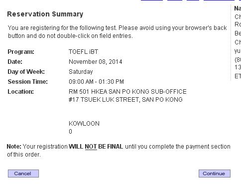 选定考试中心和场次后,会跳出确认页面,请仔细查看确认信息,如果发现选错场次,请点击左下角的Cancel,如果无误,请点击继续。