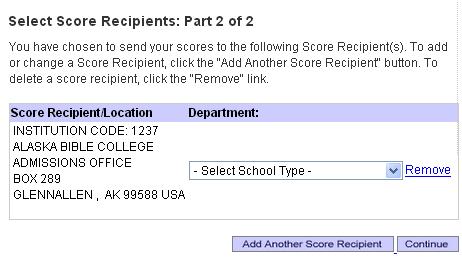之后,请填写心仪学校收件信息。可以通过校名、学校代码、国家省份的方式进行检索。建议考生使用校名或代码的方式查找,筛查量较小,结果更精确。考生可以选择最多四个免费寄送学校,每填完一所,请确认并点击“Add Another Score Recipient”添加下一所高校信息。结束后,点击“继续”。