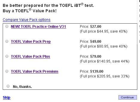 再接下来是一个很无聊的问卷。很遗憾这个问卷无法跳过,所以大家可以根据个人情况作答,作答结果主要用于ETS相关研究,和考试成绩完全无关。再然后 就是下图的TOEFL推广,其实就是一个无聊的广告,不建议考生购买,所以无需选择任何一项,可以直接点击左下角“Skip”跳过这一部分。