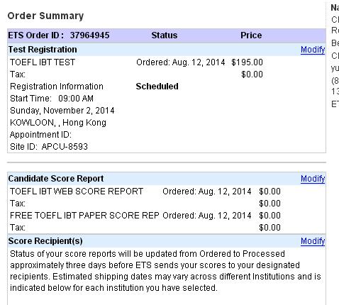 下面才是报考托福的重头戏,确认考试信息。页面会跳出场次、考试时间、地点、收费、寄送成绩单院校等信息,请考生认证确认。无误后点击右下角的“Confirm Order”确认订单。然后进行付