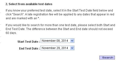 托福官网报考面向除中国大陆以外的所有地区,所以点击后首先要选择的就是考试国家。我选择了香港九龙作为范例。下一步要填写考试起止期日,也就是说你 要在以下考试日期范围内报考。我以11月8日到11月29日之间的场次为例,点击“Search”进行搜索,之后页面下会列出有空缺考位的场次和地点。