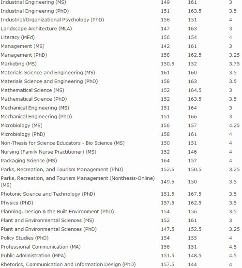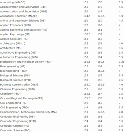 又到了2015年秋季入学申请季了,很多同学在准备最后的GRE或GMAT的冲刺考试,为了更好的给同学们一个参照,陈老师特别为大家总结了2014入学季美国排名前50的大学按不同专业划分所要求的GRE及GMAT单项及写作平均要求的分数。希望大家有个自我评估及参考,为确定目标院校及专业做好充足的准备。