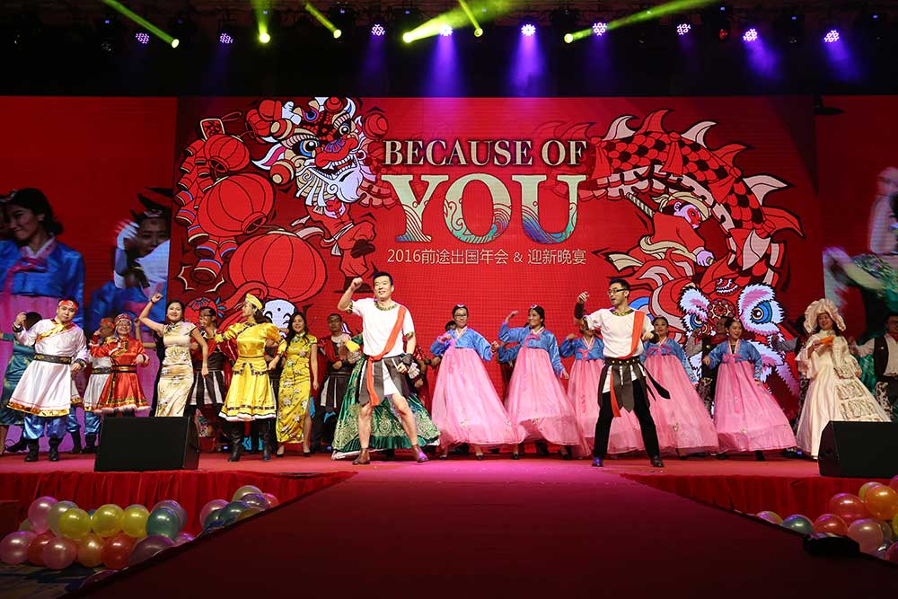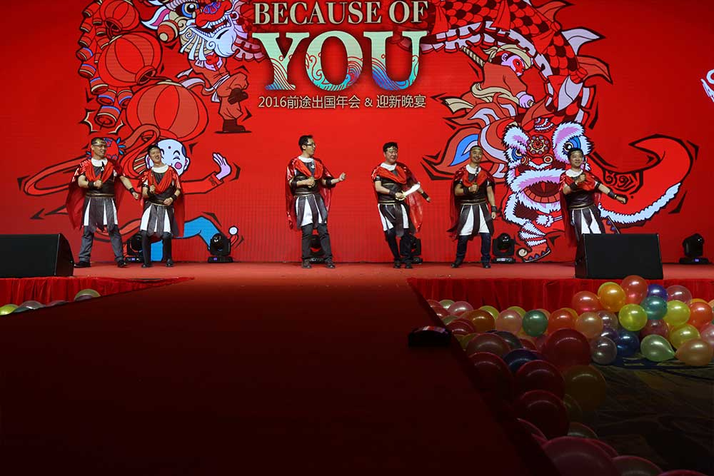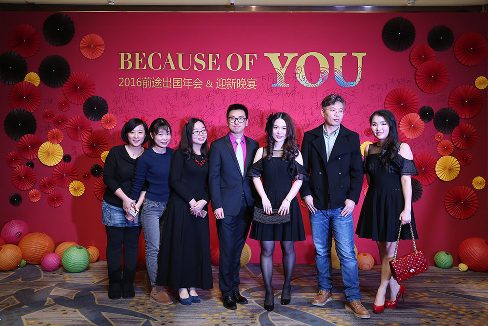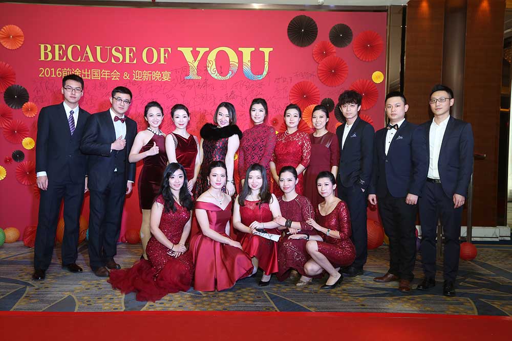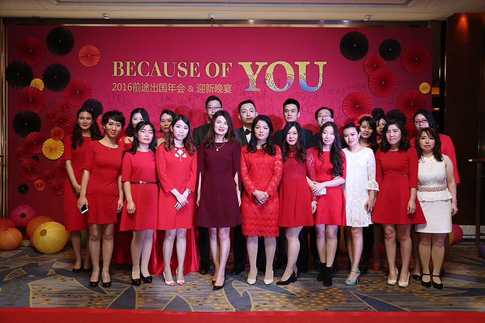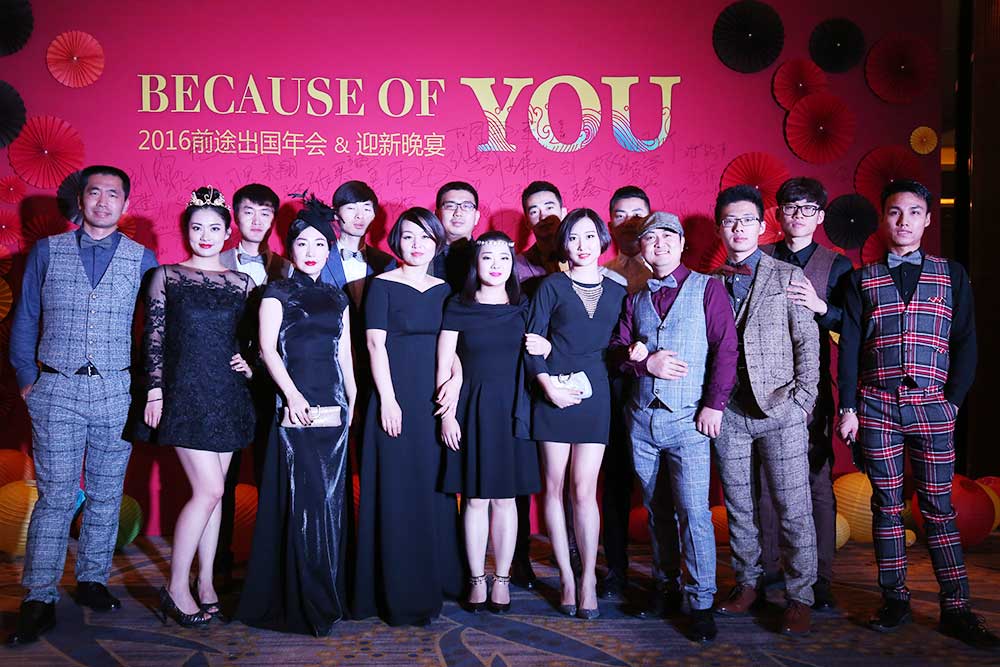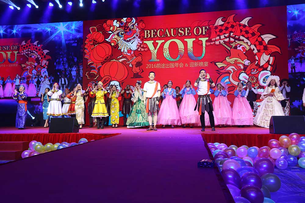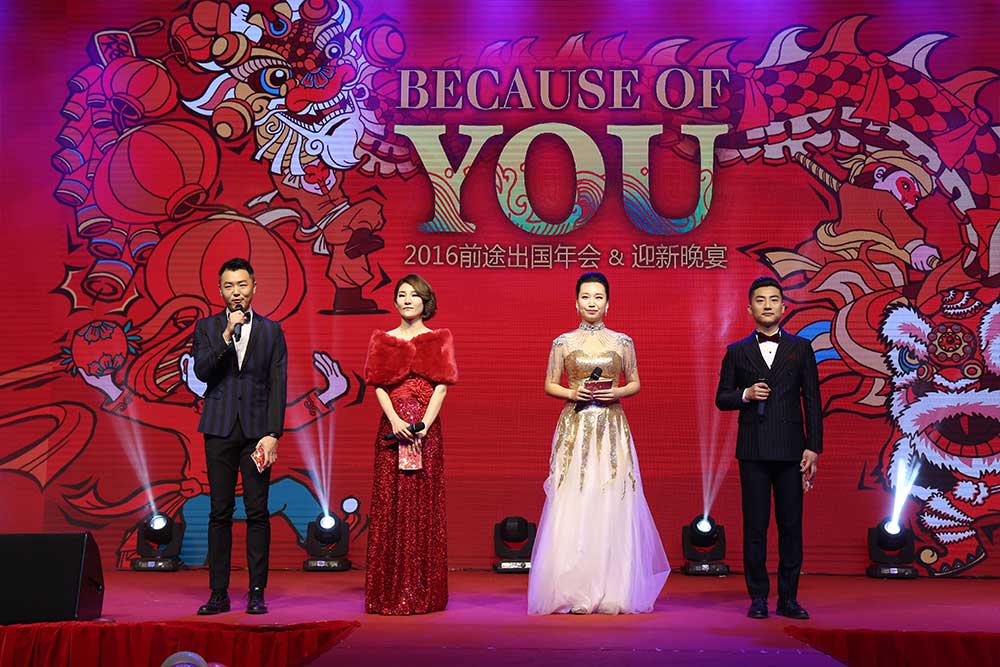 2016年1月22日,2016前途出国“BECAUSE OF YOU”年会在嘉里大酒店,前途人演绎了一场精彩的年会。本次年会北京前途总部的伙伴们和分公司代表们欢聚一堂,可口的食物、华丽的舞蹈、幽默的小品、美妙的歌声给大家视听享受的同时,更有福利满满的游戏和激动人心的各种大奖掀起了一轮又一轮的高潮。 年会圆满成功是全体前途人众志成城的果实!感谢公司领导们对年会筹备的大力支持,感谢市场部、网络营销部同事们的对年会策划、设计和网络宣传的全力支持,感谢所有演员、主持人、模特们辛苦排练和精彩演出,感谢所有到场的前途人! 正因为有你,有你们,前途精彩无限!