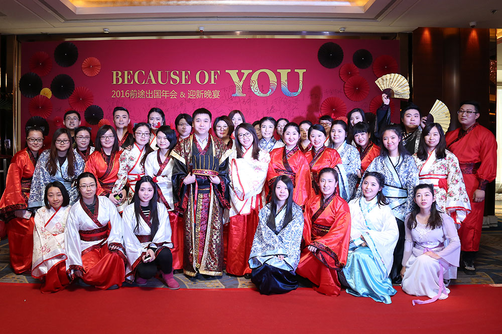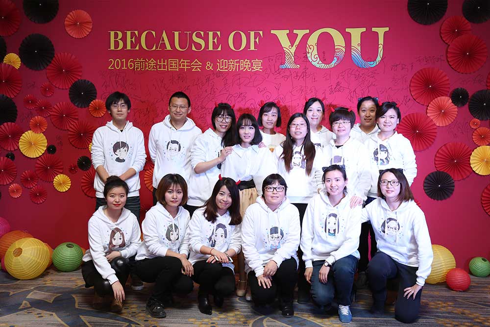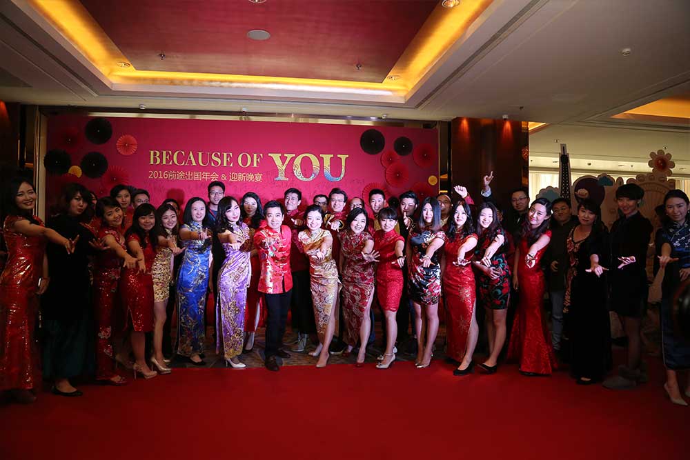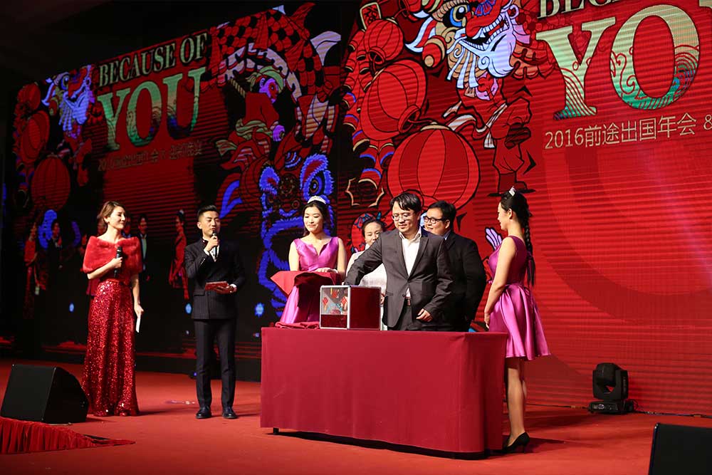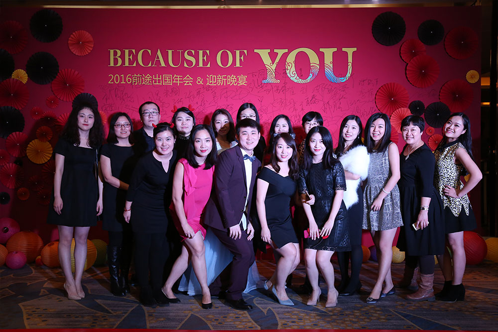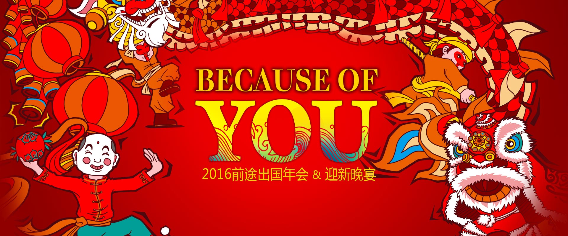 2016年1月22日,2016前途出国“BECAUSE OF YOU”年会在嘉里大酒店,前途人演绎了一场精彩的年会。本次年会北京前途总部的伙伴们和分公司代表们欢聚一堂,可口的食物、华丽的舞蹈、幽默的小品、美妙的歌声给大家视听享受的同时,更有福利满满的游戏和激动人心的各种大奖掀起了一轮又一轮的高潮。 年会圆满成功是全体前途人众志成城的果实!感谢公司领导们对年会筹备的大力支持,感谢市场部、网络营销部同事们的对年会策划、设计和网络宣传的全力支持,感谢所有演员、主持人、模特们辛苦排练和精彩演出,感谢所有到场的前途人! 正因为有你,有你们,前途精彩无限!