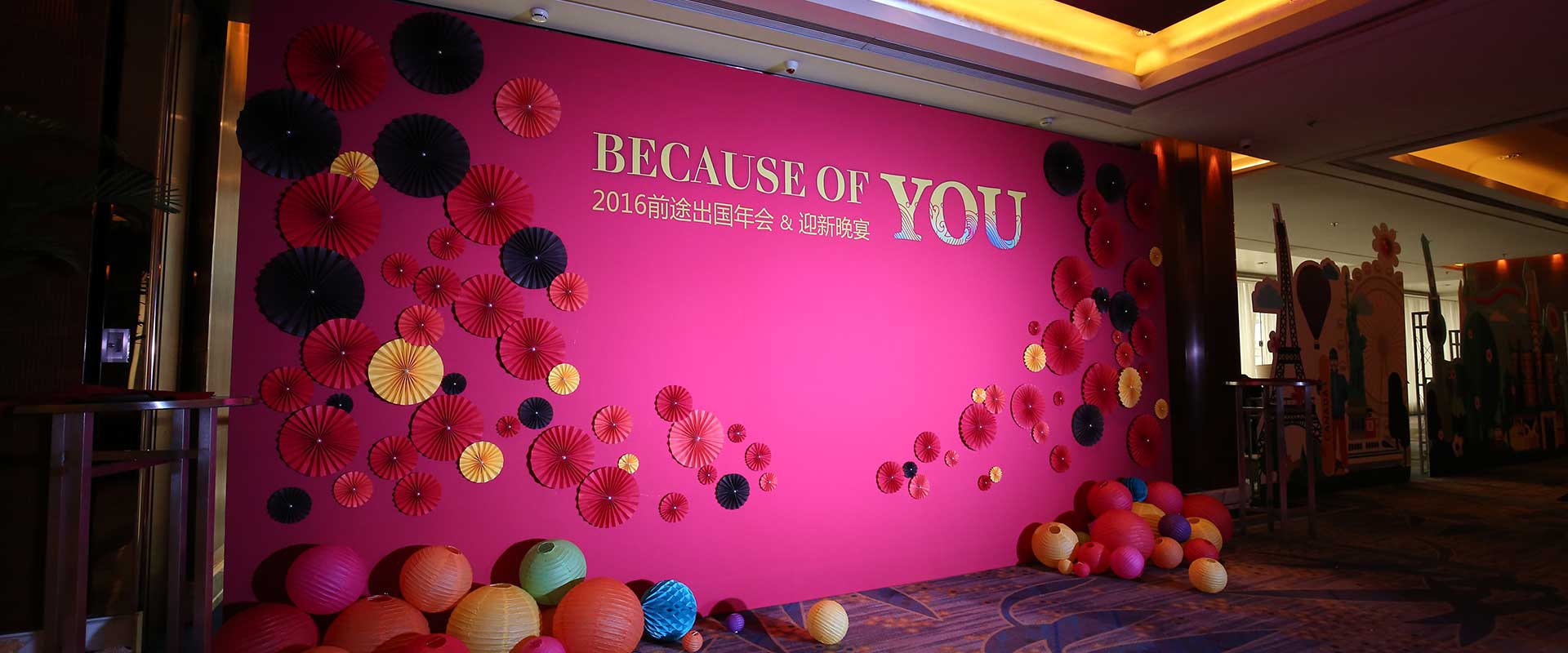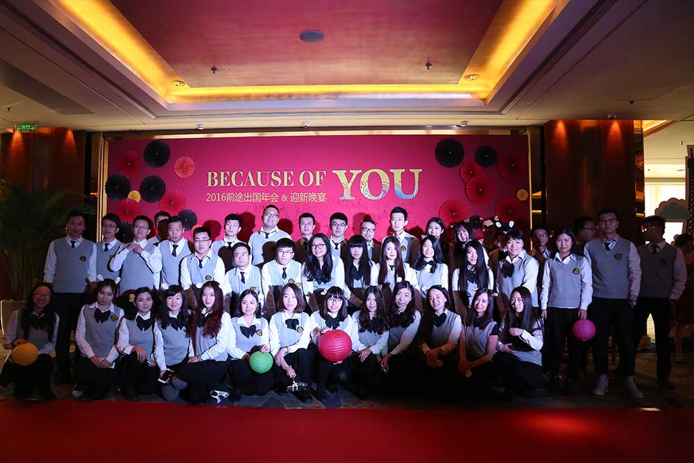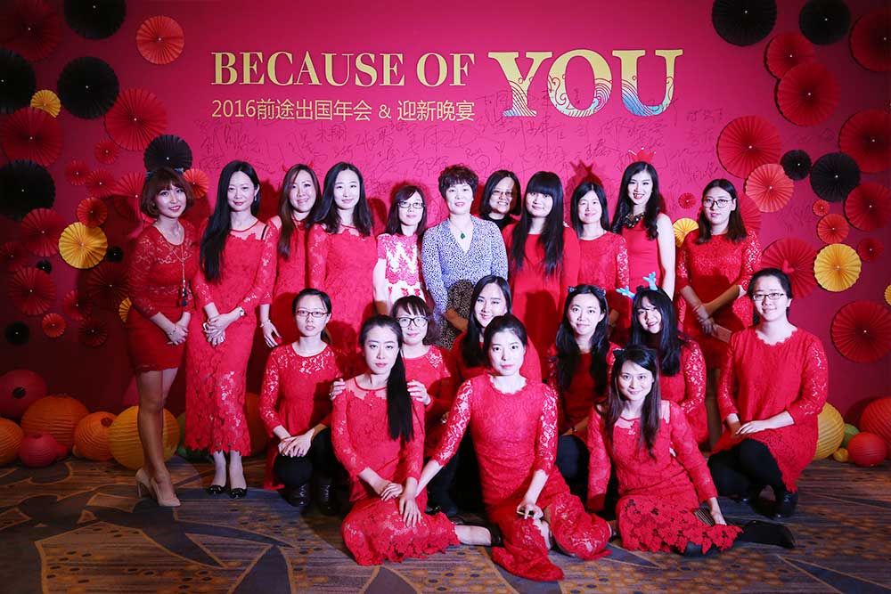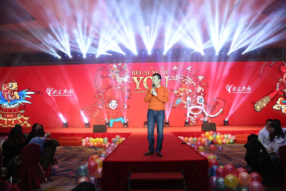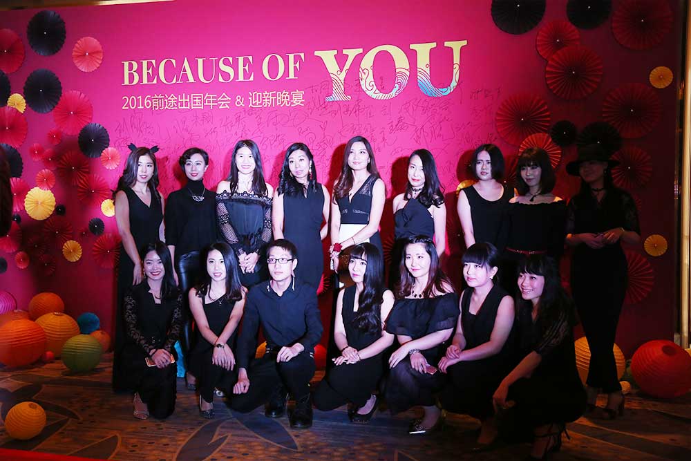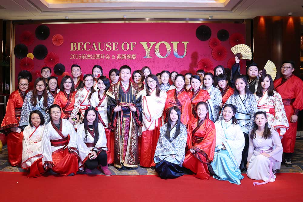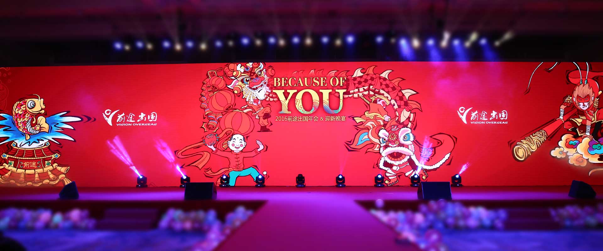 2016年1月22日,2016前途出国“BECAUSE OF YOU”年会在嘉里大酒店,前途人演绎了一场精彩的年会。本次年会北京前途总部的伙伴们和分公司代表们欢聚一堂,可口的食物、华丽的舞蹈、幽默的小品、美妙的歌声给大家视听享受的同时,更有福利满满的游戏和激动人心的各种大奖掀起了一轮又一轮的高潮。 年会圆满成功是全体前途人众志成城的果实!感谢公司领导们对年会筹备的大力支持,感谢市场部、网络营销部同事们的对年会策划、设计和网络宣传的全力支持,感谢所有演员、主持人、模特们辛苦排练和精彩演出,感谢所有到场的前途人! 正因为有你,有你们,前途精彩无限!