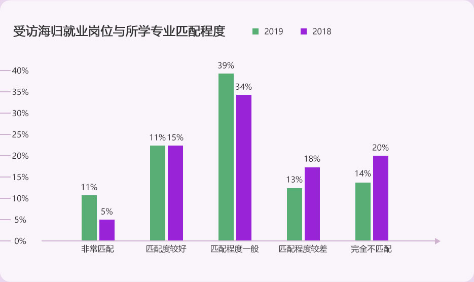 根据新东方《2020中国留学白皮书》显示,39%的受访海归认为其就业岗位与留学专业的匹配度一般,与18年数据相比而言,“所学非所用”现象虽得到缓解,但认为“匹配程度较差”和“完全不匹配”的人数占比依然达到近三成。