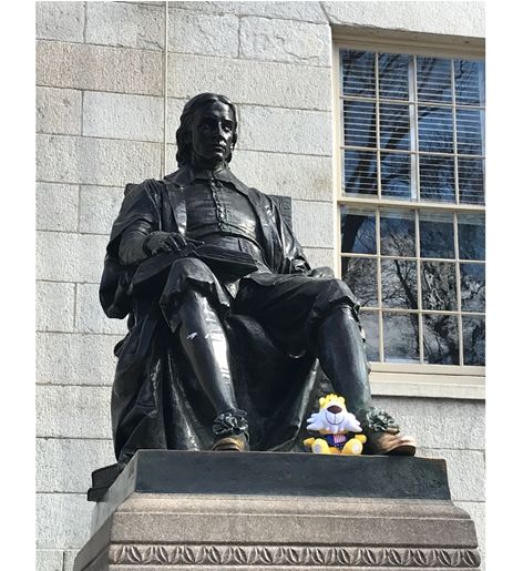 “哎呦”小虎突然吼了一声,它抬头一看,发现自己被一蹲雕塑挡住了。“这是什么?”小虎心里纳闷,决定走近仔细一看,雕塑上刻着:约翰哈佛,建校者,1638年。