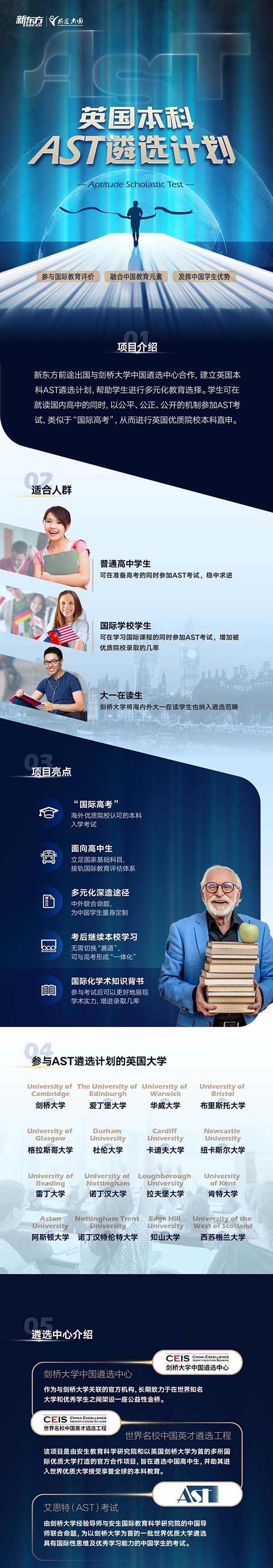新东方前途出国与剑桥大学中国遴选中心合作,建立英国本科AST遴选计划,帮助学生进行多元化教育选择。学生可在就读国内高中的同时,以公平、公正、公开的机制参加AST考试,类似于“国际高考”,从而进行英国优质院校本科直申。