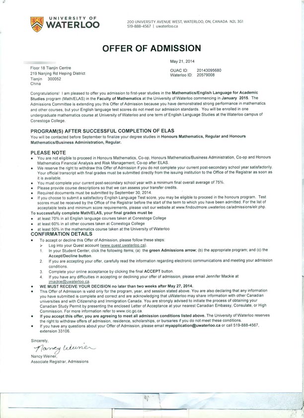 3、往往在准备的时候学生和家长都会忽略必要的软文,或者相应的课程描述。比如滑铁卢大学就需要提供高中阶段数学课程的课程描述。这个也是申请递交材料的必须部分。