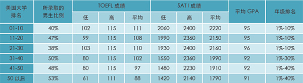 从上面表格中TOEFL、SATI 的平均成绩,我们可以看出随着学校排名的下降,大部分录取的平均分数也有下降。美国前21-30 的录取平均分数不降反升,也说明了该区间的申请难易度并不小于前10-20。通过对比近几年的白皮书数据,咨询师发现前十的录取分数一直攀高,也说明了中国学生为了进入名校,花费了更多的精力在标准化考试上。
