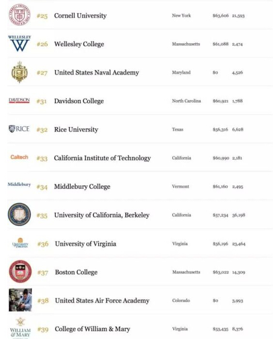 排名最高的三所公立大学(非军校类)分别是加州大学伯克利分校(排名第35)、弗吉尼亚大学(University of Virginia,排名第36)和威廉玛丽学院(College of William and Mary,排名第39)。美国联邦军事院校中,有三所跻身美国一流高等教育院校排行榜:美国军事学院,即西点军校(United States Military Academy,排名第11)、其次是美国海军军官学校(United States Naval Academy,排名第27)和美国空军军官学校(United States Air Force Academy,排名第38)。