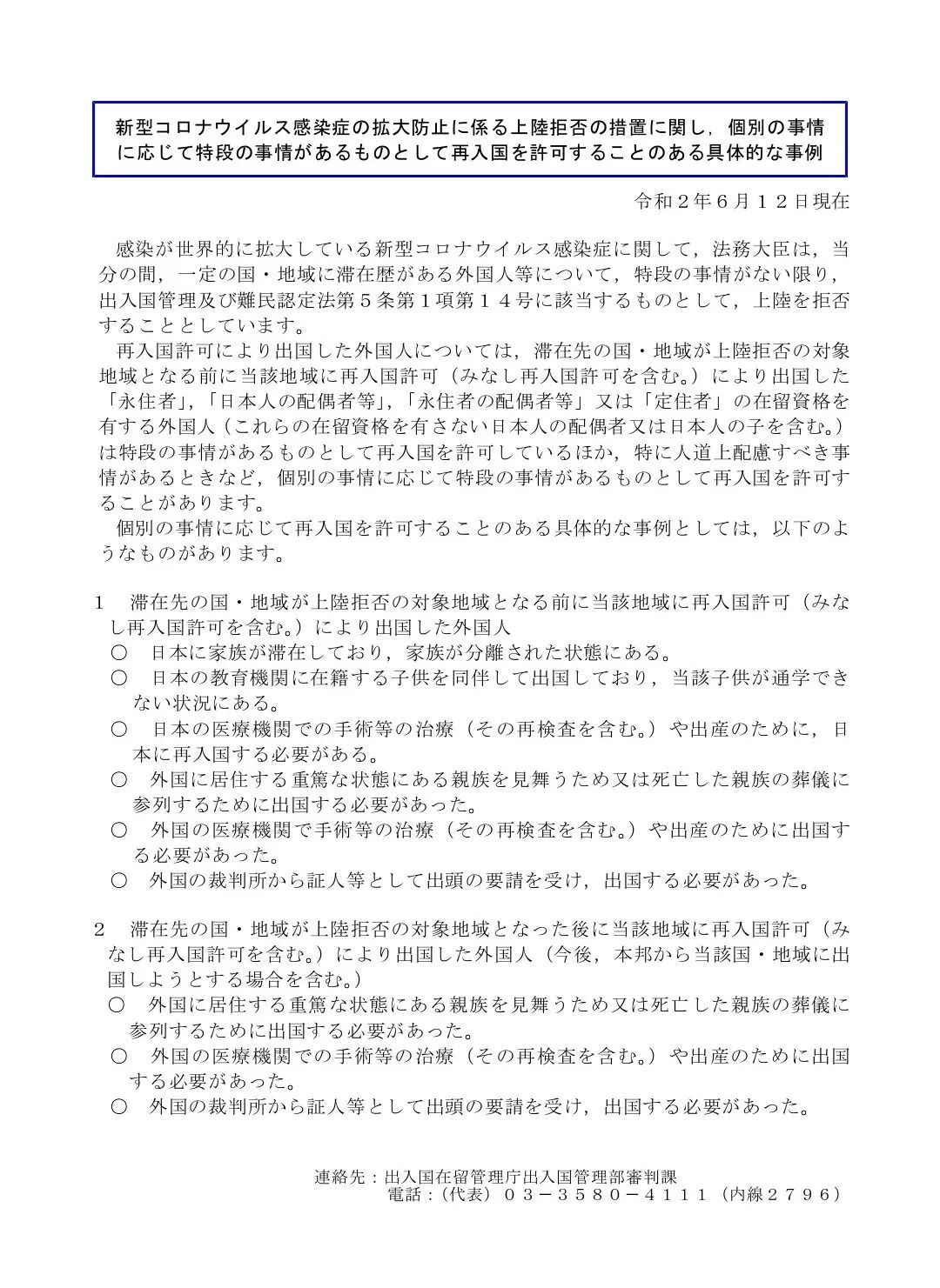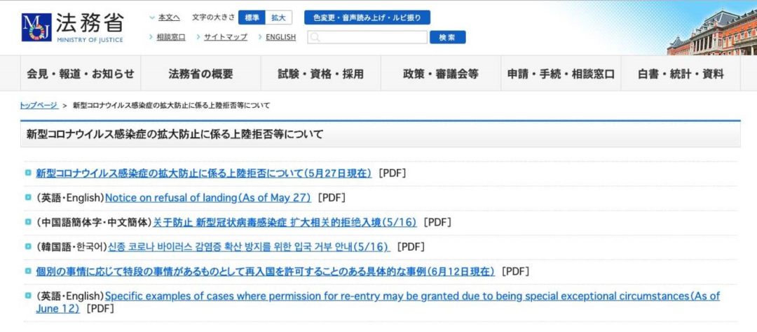 据日本法务大臣表示,目前,在一些国家和地区有滞留经历的外国人等,除非有特殊的情况,否则将以符合出入境管理和难民认定法第5条第1项第14号的形式被拒绝入境。