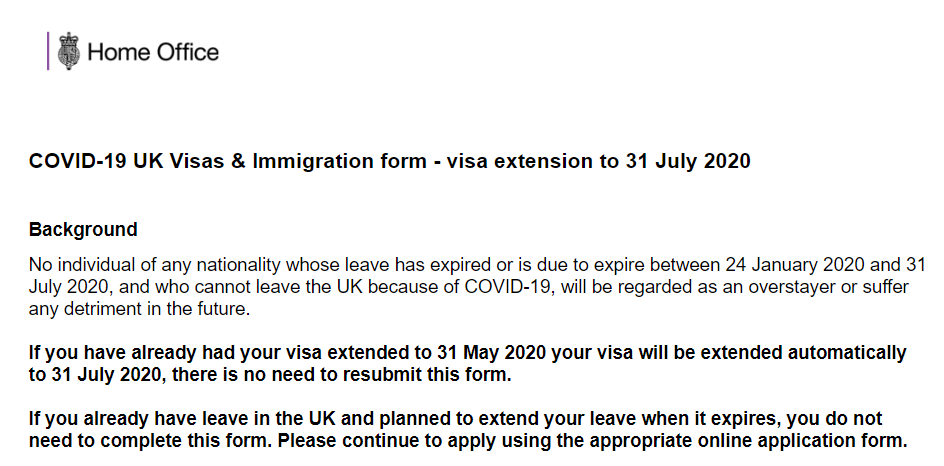 因受到航班取消或隔离政策影响暂时无法离开英国,那么你的签证有效期将被自动延长至2020年7月31日。