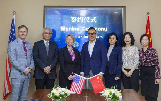 2019年4月9日上午,新东方前途出国与The Knox School独 家合作签约仪式在北京新东方总部举行。新东方首 席执行官周成刚、新东方前途出国分公司管理中心美国中学部总监赵耀、新东方前途出国外联部总监宋丹、北京中关村美国中学一部总监李艳兰与 The Knox School学校董事长Clement Chan、校长Kristen Tillona-Baker均出席了签约仪式。