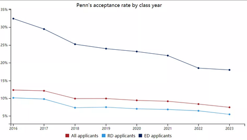 过去十年,宾大的录取率一路走低,从2016届32%的录取率,一直下降到2023届的17.98%。今年,共有6453人申请宾大,1269人收获offer,录取率达到了19.7%——官方表示这是十年来首次出现正增长。