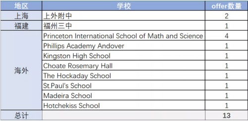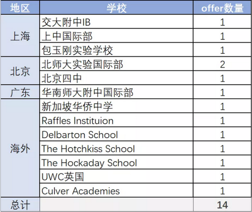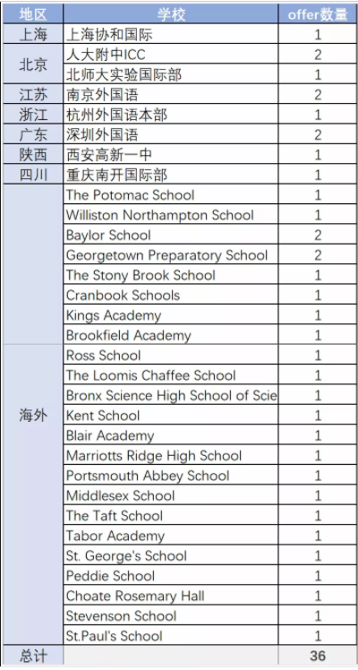 哥伦比亚大学:今年哥大发出了13枚offer,与去年基本持平。上年度上海只有复旦WLSA收获哥大offer,今年人选变成了包校;北京方面去年则是由体制内高中(北师大实验及人大附中)将两枚offer收入囊中,今年哥大则比较青睐国际学校。