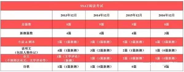 阅读从篇数上来看,从去年同期的9篇缩减到了8篇,但是难度方面确是只增不减。难度的加大主要表现在对于内容的调整上。从下图2013-2016年历年12月SSAT考试分析可以看出来,首先是阅读题库更新加快,主要表现在重复遵循最新原则,今年的几场考试大多数出自15年11,12月加入的新题。