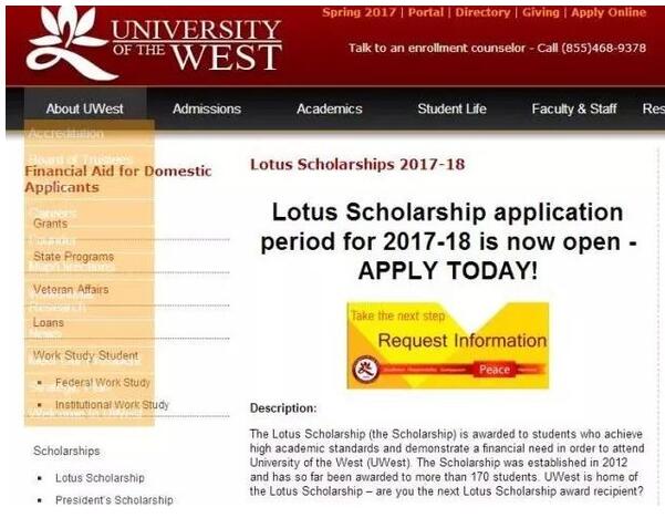 2017年美国西来大学Lotus奖学金分为金奖和银奖,最高金额分别为10000美元和5000美元。