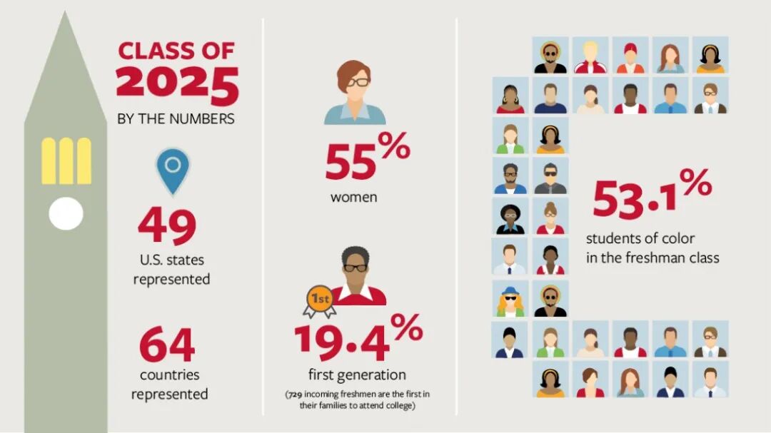 据学校统计,2025届新生中的国际生比例为14%,录取学生中校友子女占10%。此外,还有200名学生从上一年的录取中推迟到今年秋季入学,增加了今年入学的总人数。