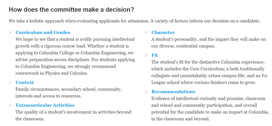 而在官网的说明中,哥大公开地告诉了学生们自己的录取倾向:学校青睐热情、阳光、积极、多元发展的学生,建议大家的课外活动一定要兼具广度与深度。建议大家在文书中多展现自己的求知欲以及兴趣,并且向哥大证明自己可以真正深入钻研这一领域,或是解决一些实际问题。