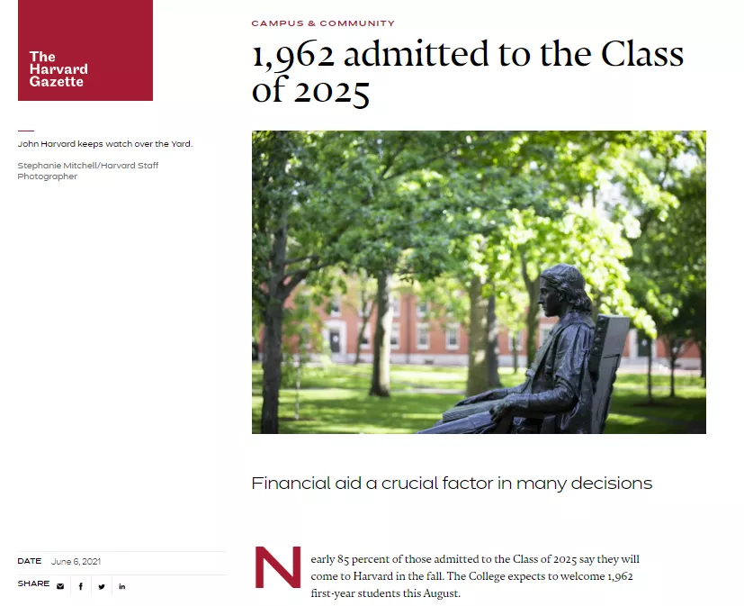 2021年共有57,435名学生向哈佛大学递交申请,人数比去年增长43%。但同时总体录取率降至3.4%,成为哈佛历史上最低录取率。