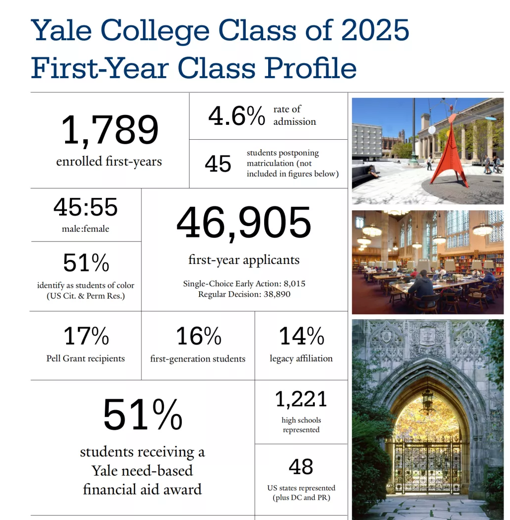 2021年秋季,包括Gap一年的335名学生和26名转学生在内,共有1,789人入学耶鲁,比起2020年秋季入学的1,267人增加了41.2%。