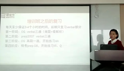 老师建议GMAT备考从准备托福开始,有了相当的词汇积累后再去考GMAT,效果非常不错。她还给出了阶段性的备考策略,将GMAT的准备分为四个阶段。第一阶段反复学习OG语文资料,老师强调OG是无论怎样重视都不过分的资料,建议结合每题的解析反复磨练。第二阶段使用prep2007语文资料,好的实力同样需要一遍又一遍的捶打。第三阶