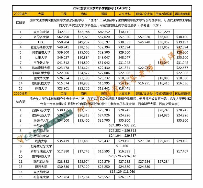 今天我们把加拿大医博和综合类所有大学的所有专业的学费都给大家做了一个汇总: