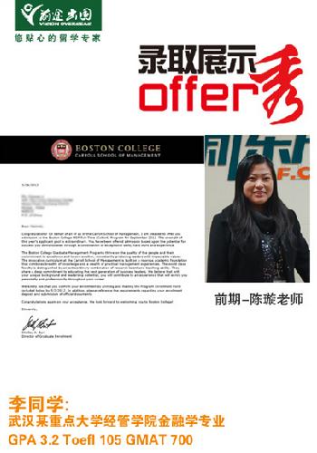 由于不断升高的中国学生GMAT成绩和对金融专业的追捧,美国金融专业硕士的竞争一向是商科专业里面最激烈的。和国内很多大牛相比,这位同学T/G成绩只是达到了名校录取的门槛,并且GPA也不高,因此在硬件条件上并没有优势。在沟通的过程中我们发现这位同学有丰富的社会活动,多次因为社会活动突出而获得嘉奖,而且有三段在国有,商业,及跨国银行的不同实习经历。在文书中我们一方面突出他在一次竞赛中是如何发挥领导作用,在短时间内合理分派任务最终赢得大奖;另一方面展现这位同学通过在不同类型银行的实习,对中国金融业有了更为全面的理解和思考。同时,我们在申请后期也积极与学校联系,争取到了一次珍贵的面试机会。与众不同的文书视角和她在面试中出色的表现,使她最终获得了金融学排名第三的波士顿学院的青睐,又一次创造了奇迹。BC的MSF录取一向有注重工作经验的传统,以往录取的学生平均工作年限是3.2年。BC的MSF项目今年在中国大陆仅录取八人,这位同学是其中唯一一个没有全职工作经验的学生。